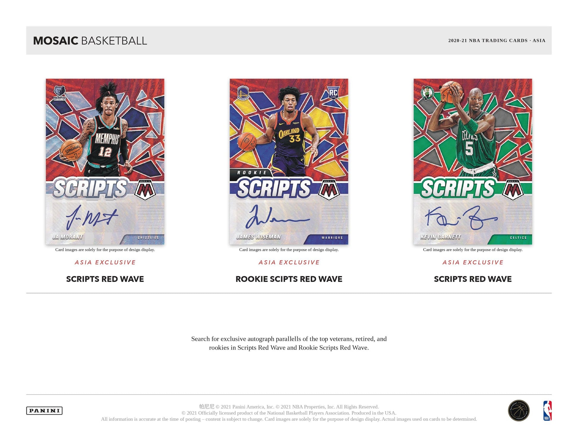 - Look for randomly inserted autographs in the Asia exclusive Scripts Red Wave and Rookie Scripts Red Wave of the top NBA players from the past to present.