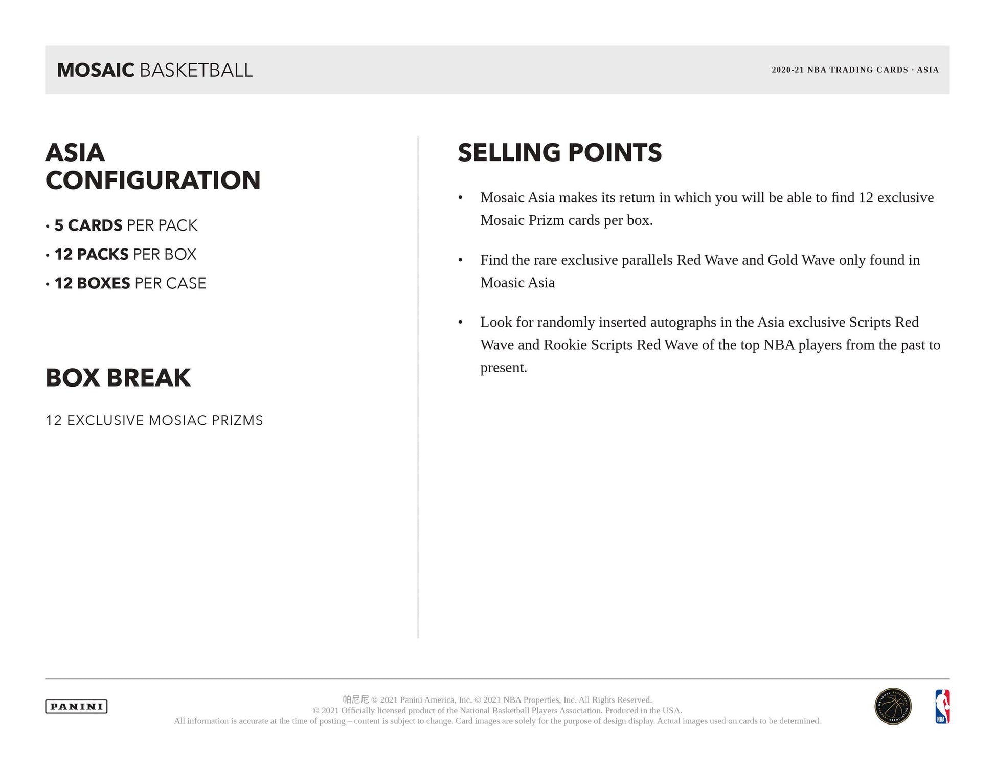 - Mosaic Asia makes its return in which you will be able to find 12 exclusive Mosaic Prizm cards per box.