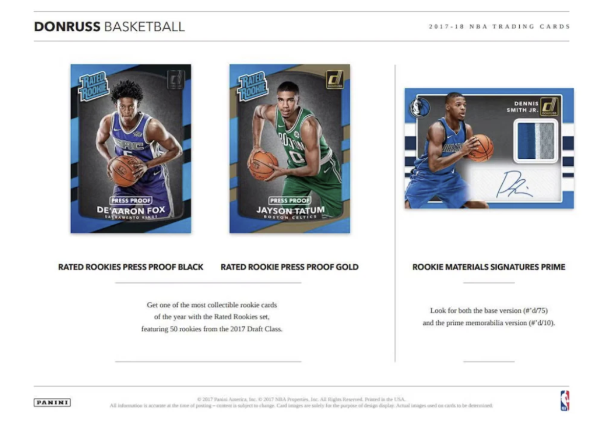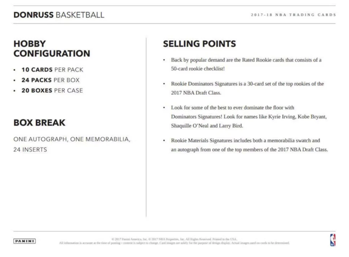 Each Box contains One Autograph, One Memorabilia, and 24 Inserts! Back by popular demand are the Rated Rookie cards that consists of a 50-card rookie checklist! Rookie Dominators Signatures is a 30-card set of the top rookies of the 2017 NBA Draft Class. Look for some of the best to ever dominate the floor with Dominators Signatures! Look for names like Kyrie Irving, Kobe Bryant, Shaquille O'Neal and Larry Bird. Rookie Materials Signatures includes both a memorabilia swatch and an autograph from one of the top members of the 2017 NBA Draft Class. Key Rookies: Lonzo Ball, Markelle Fultz, De'Aaron Fox, Jayson Tatum, Lauri Markkanen, Kyle Kuzma, Bam Adebayo, Josh Jackson, Justin Jackson, Donovan Mitchell, Luke Kennard, Dennis Smith, Jr., John Collins. PRODUCT BREAKDOWN: DOMINATORS SIGNATURES: Elite Signatures features a checklist of 40 players with every card (sequentially #'d/40 or less.) Every player also has a Gold version (#'d/10) and a Black Version (#'d/1.) ROOKIE DOMINATORS SIGNATURES GOLD: Thirty of this year's top rookies are looking to dominate the new autograph market! NEXT DAY AUTOGRAPHS: When each player arrives at the Rookie Photo Shoot, he has his photo taken, card files are sent to the printer, returned to the Rookie Photo Shoot overnight, and signed - all within 24 hours! RATED ROOKIES PRESS PROOF BLACK/RATED ROOKIE PRESS PROOF GOLD: Get one of the most collectible rookie cards of the year with the Rated Rookies set, featuring 50 rookies from the 2017 Draft Class. ROOKIE MATERIALS SIGNATURES PRIME: Look for both the base version (#'d/75) and the prime memorabilia version (#'d/10).