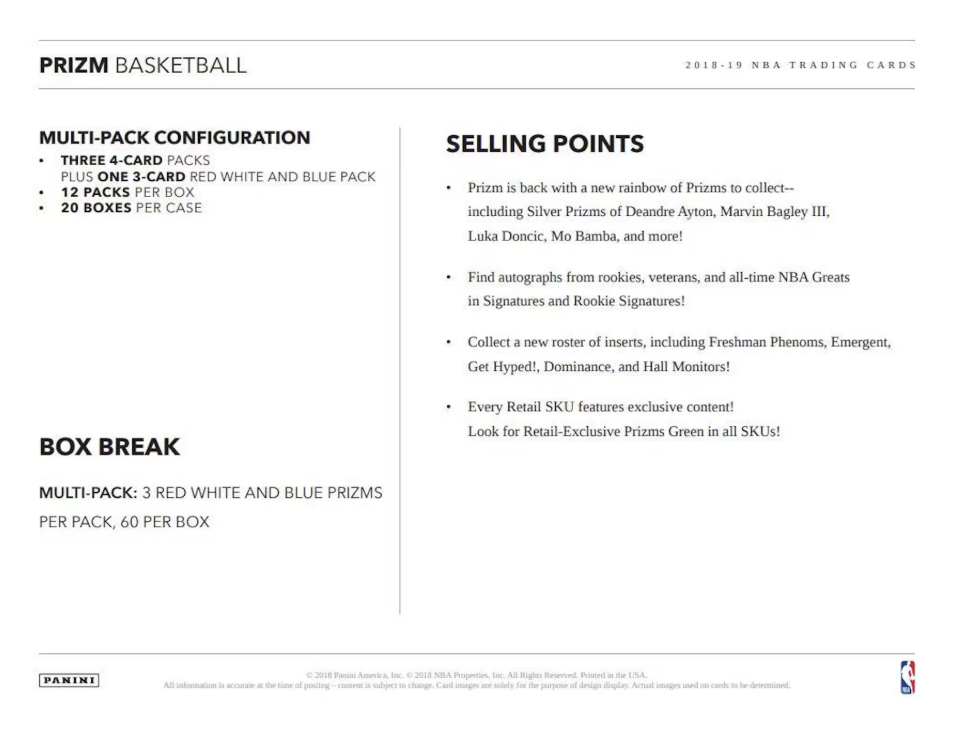 PRIZMS SILVER:Â Welcome to the home of the Prizm card! Look for Prizms of your favorite NBA players, from rookies to all-time greats! Prizm features a 300-card base set, making that special Prizm pull, that much more special! Multi-Pack features an Exclusive: Red White and Blue Prizm Parallel.