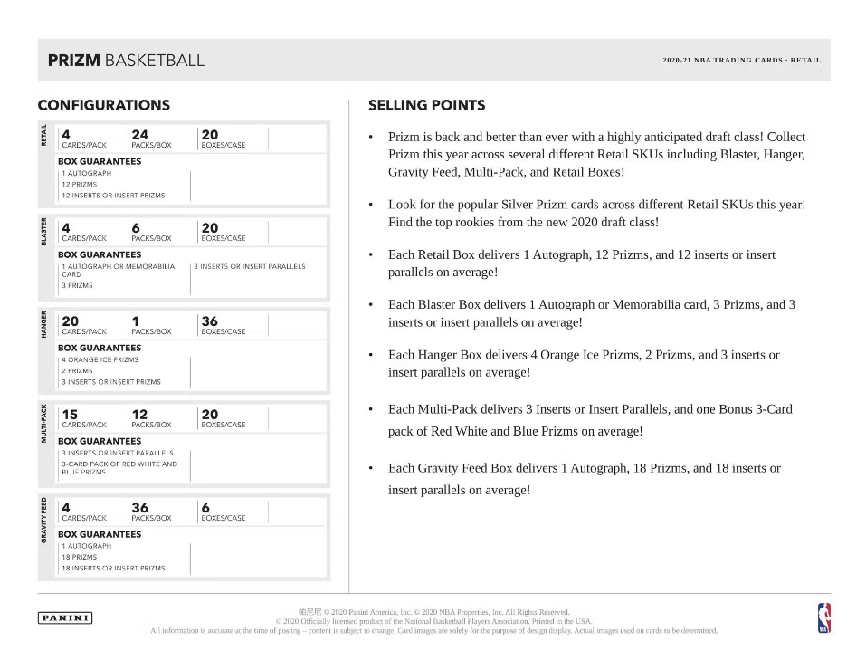 Look for Prizms of your favorite NBA players, from rookies to all-time greats! Prizm features a 300-card base set, making that special Prizm pull, that much more special!