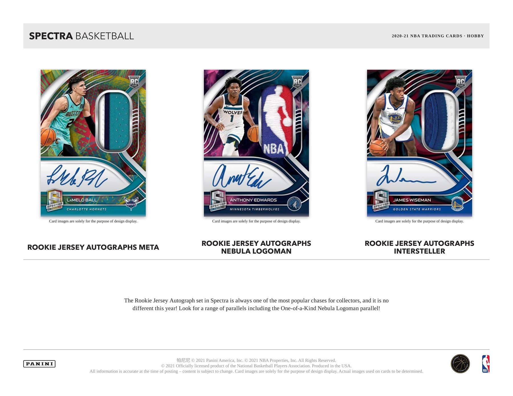 ROOKIE JERSEY AUTOGRAPHS META/ROOKIE JERSEY AUTOGRAPHS NEBULA LOGOMAN/ROOKIE JERSEY AUTOGRAPHS INTERSTELLAR:Â The Rookie Jersey Autograph set in Spectra is always one of the most popular chases for collectors, and it is no different this year! Look for a range of parallels including the One-of-a-Kind Nebula Logoman parallel!