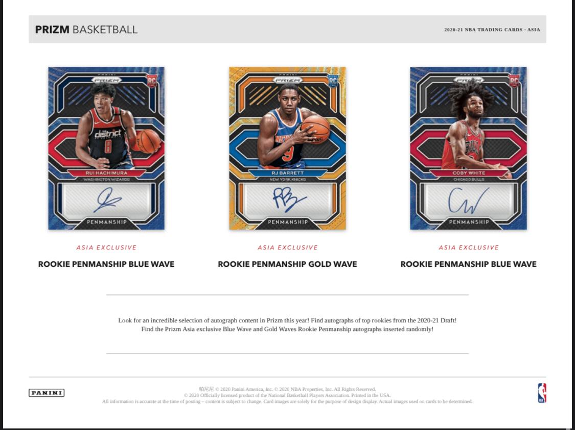 - Find autographs of top rookies from the 2020-21 Draft in Rookie Penmanship! Look for the Prizm Asia Exclusive Blue Wave and Gold Wave parallels!