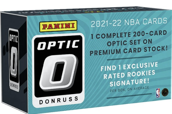 2021-22 Donruss Optic Premium Box Set Basketball puts the main Donruss Optic NBA series on exclusive card stock and adds one rookie autograph per box.
