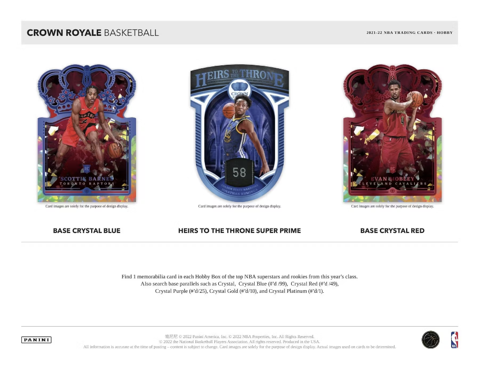 MEMORABILIA AND PARALLEL CARDS: Find one memorabilia card in each hobby box of the top NBA superstars and rookies from this year's class. Also search for base parallels such as Crystal, Crystal Blue (#'d /99), Crystal Red (#'d /49), Crystal Purple (#'d/25), Crystal Gold (#'d/10), and Crystal Platinum (#'d/1).