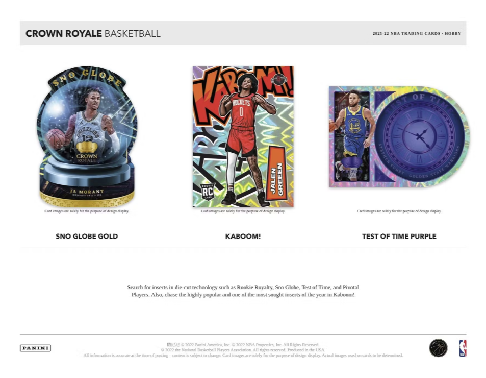 INSERTS: Search for inserts in die-cut technology such as Rookie Royalty, Sno Globe, Test of Time, and Pivotal Players. Also, chase the highly popular and one of the most sought inserts of the year in Kaboom!
