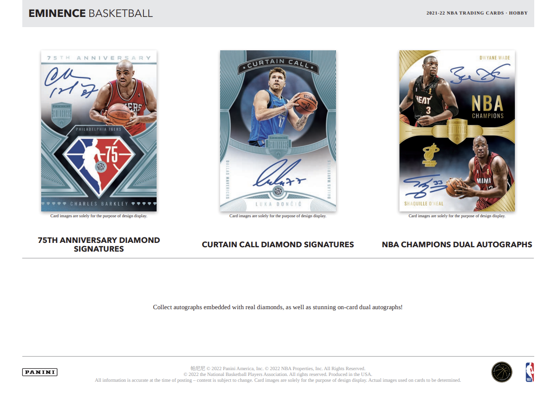 Find patch autographs and precious metal cards that feature the NBA’s best and brightest! Look for a variety of rookie autographs and rookie patch autographs throughout Eminence! Collect autographs embedded with real diamonds, as well as stunning on-card dual autographs!