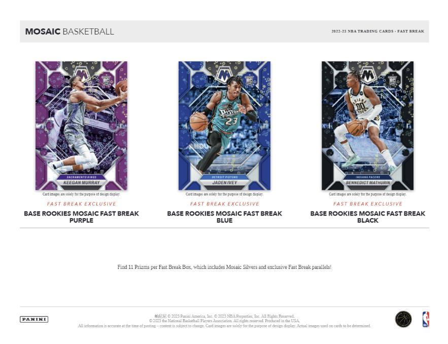 BASE / BASE ROOKIES:Â Find 11 Prizms per Fast Break Box, which includes Mosaic Silvers and exclusive Fast Break Parallels!
