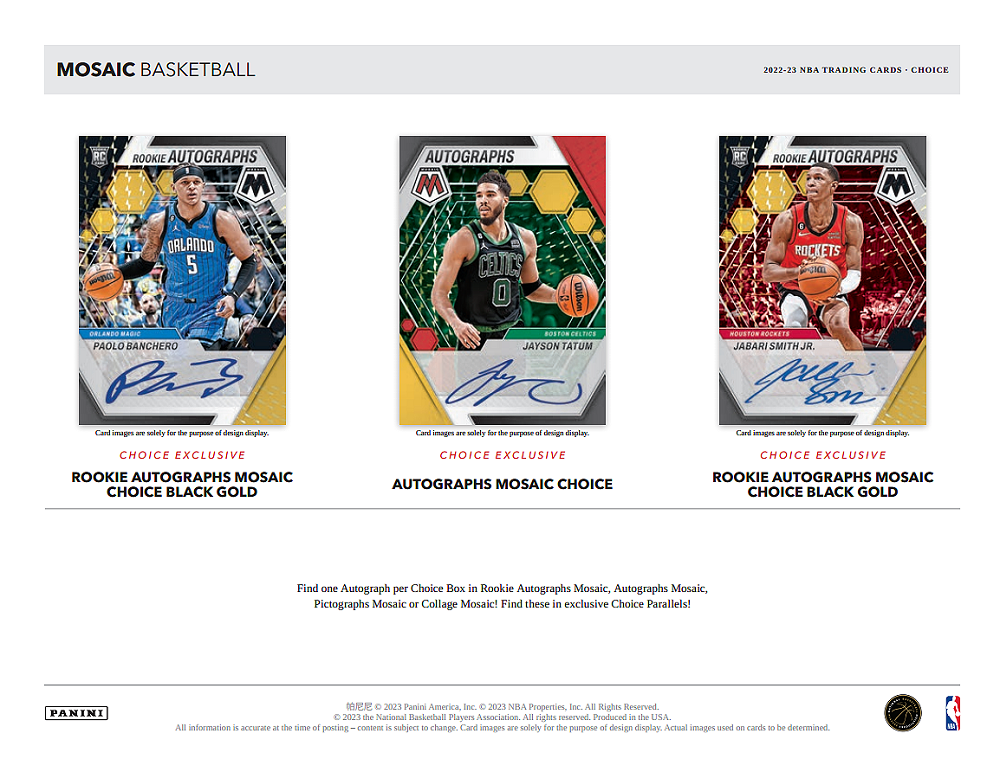 • Find Autographs of the top NBA stars and rookies in Autographs Mosaic, Rookie Autographs Mosaic, Pictographs Mosaic and Collage Autographs Mosaic! Look for these Inserts in Choice-Exclusive parallels: Mosaic Choice and Mosaic Choice Black Gold (#’d/8)!