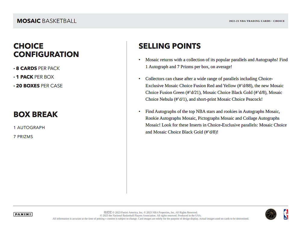 The 2022-23 Panini Mosaic NBA Trading Card Box (Choice) contains 8 cards per pack.1 pack per box, 20 boxes per case!