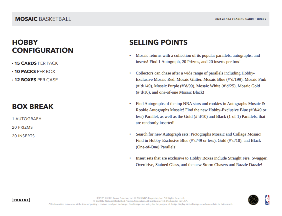 2022-23 Panini Mosaic Basketball returns with a collection of its popular parallels, autographs, and inserts! Find 1 Autograph, 20 Prizms, and 20 inserts per box! Collectors can chase after a wide range of parallels including Hobby-Exclusive Mosaic Red, Mosaic Glitter, Mosaic Blue (#’d/199), Mosaic Pink (#’d/149), Mosaic Purple (#’d/99), Mosaic White (#’d/25), Mosaic Gold (#’d/10), and one-of-one Mosaic Black! Find Autographs of the top NBA stars and rookies in Autographs Mosaic & Rookie Autographs Mosaic! Find the new Hobby-Exclusive Blue (#’d/49 or less) Parallel, as well as the Gold (#’d/10) and Black (1-of-1) Parallels, that are randomly inserted!