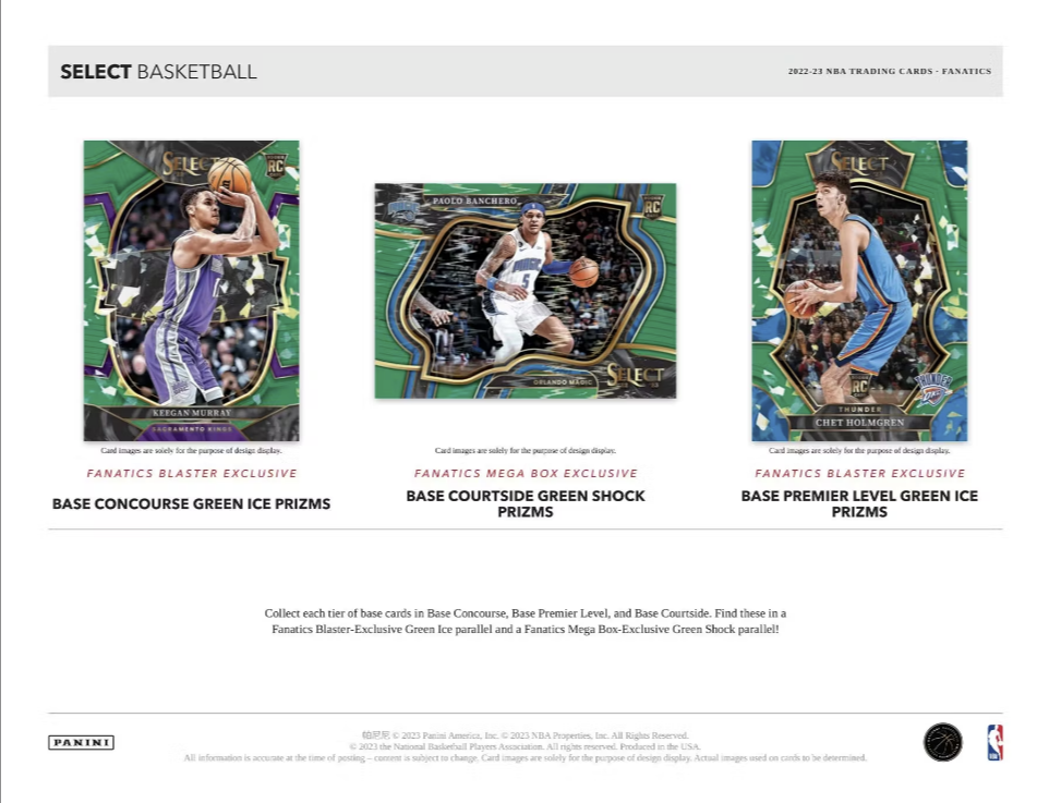 BASE CONCOURSE/COURTSIDE/PREMIER LEVEL:Â Collect each tier of base cards in Base Concourse, Base Premier Level, and Base Courtside. Find these in a Fanatics Blaster-Exclusive Green Ice parallel!