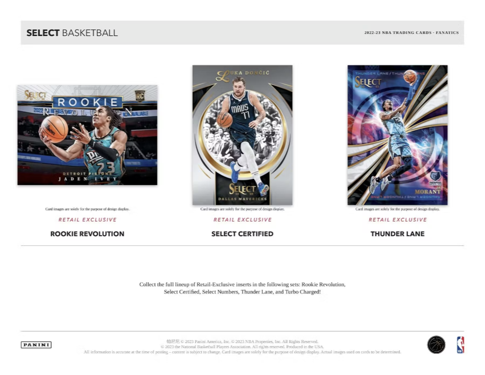 Collect all three tiers of the exclusive blue base set which include Base Concourse, Base Premier Level, and Base Courtside. Search for randomly inserted Retail-Exclusive inserts Rookie Revolution, Select Certified, Select Numbers, Thunder Lane, and Turbo Charged!