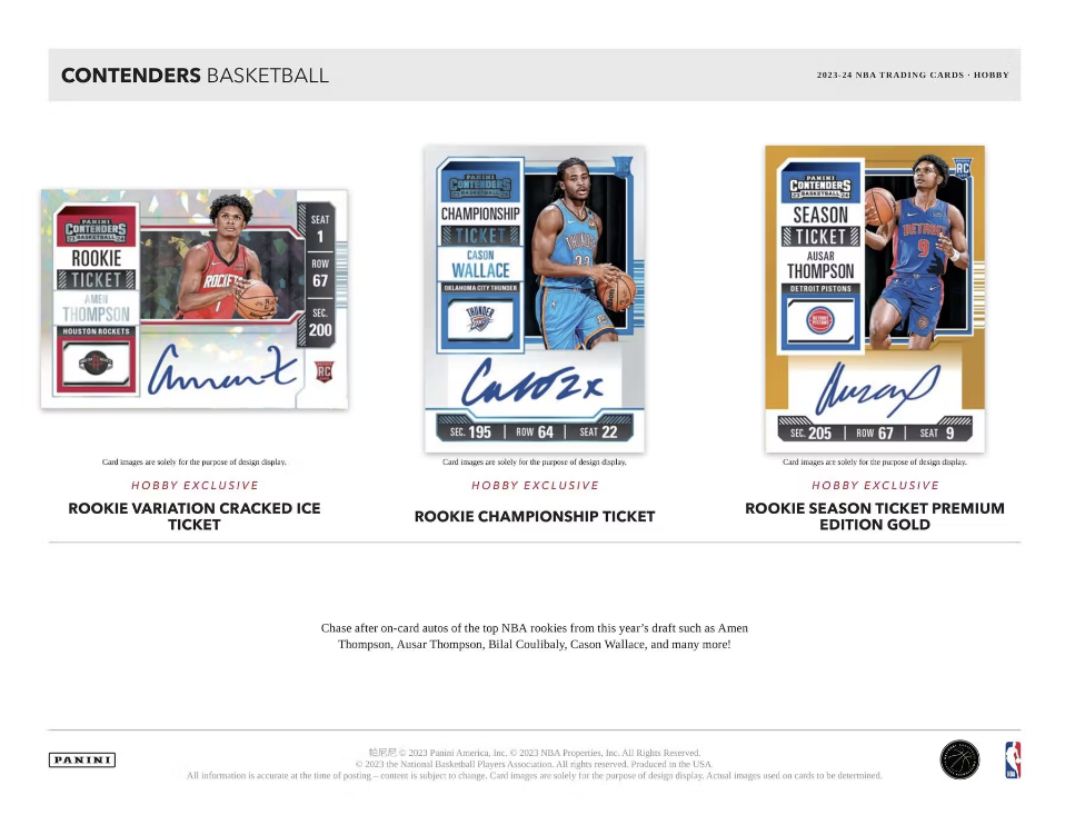 ROOKIE VARIATION CRACKED ICE TICKET / ROOKIE CHAMPIONSHIP TICKET / ROOKIE SEASON TICKET:Â Chase after on-card autos of the top NBA rookies from this year's draft such as Amen Thompson, Ausar Thompson, Bilal Coulibaly, Cason Wallace and many more!