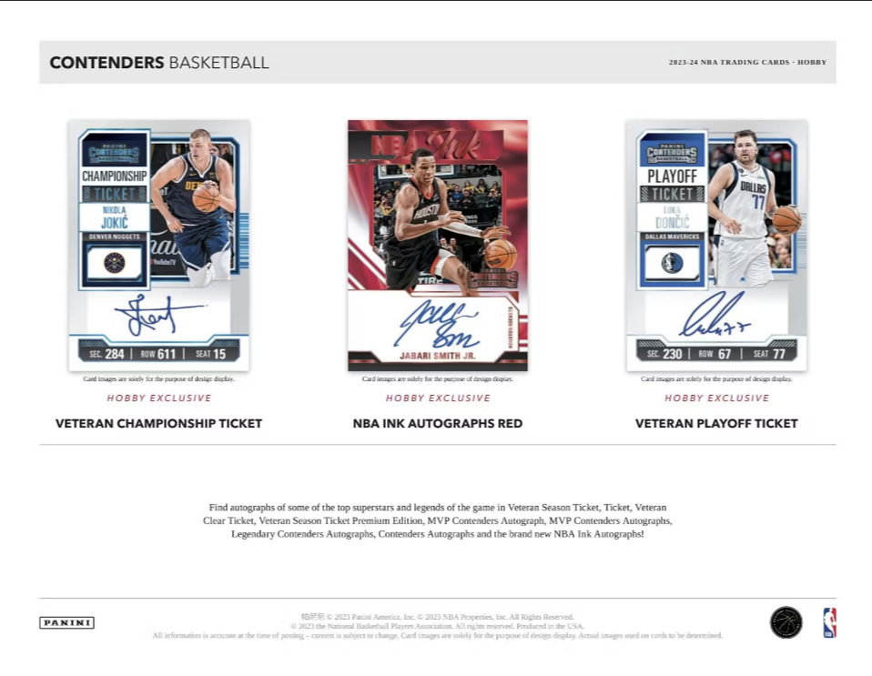 VETERAN CHAMPIONSHIP TICKET / NBA INK AUTOGRAPHS / VETERAN PLAYOFF TICKET:Â Find autographs of some of the top superstars and legends of the game in Veteran Season Ticket, Ticket, Veteran Clear Ticket, Veteran Season Ticket Premium Edition, MVP Contenders Autograph, Legendary Contenders Autographs, Contenders Autographs and the brand new NBA Ink Autographs!