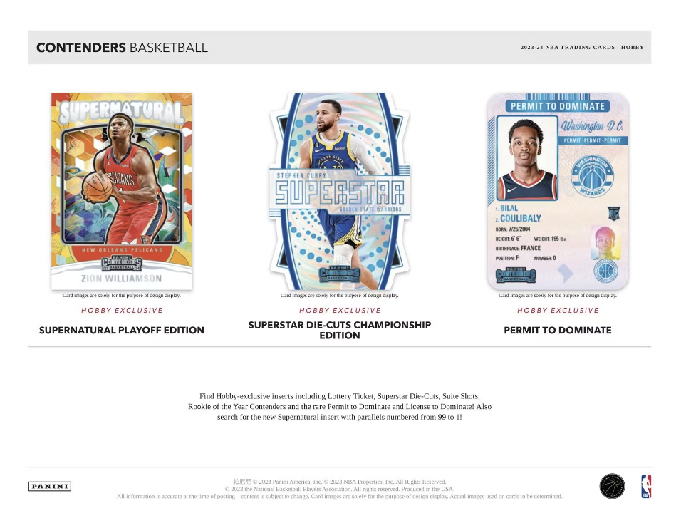 Collect the various inserts this year in Contenders, including the rare Hobby-exclusive Permit to Dominate and License to Dominate! The brand new Supernatural insert, numbered from 99 to 1, can also be found in Hobby Boxes!
