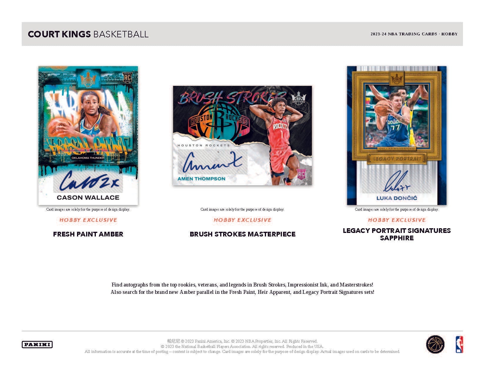 SELF EXPRESSION / STATE OF THE ART / DEBUT SHOWCASE MEMORABILIA:Â Search for the many unique inserts that Court Kings has to offer, including the short-printed Aurora, Paint by Number and State of the Art! Also look for the new Debut Showcase Memorabilia set featuring this year's exciting 2023-24 rookie draft class!