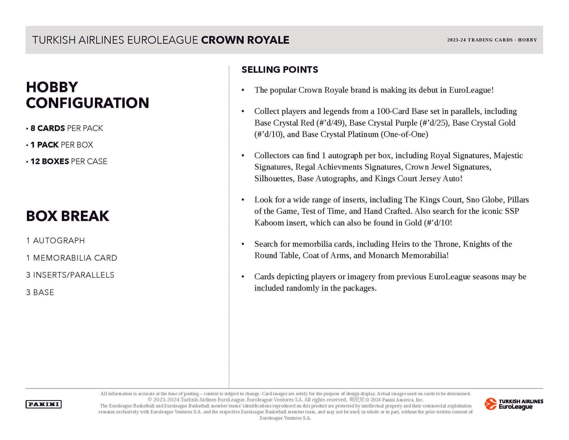 2023-24 Panini Crown Royale Turkish Airlines EuroLeague Basketball Hobby Box