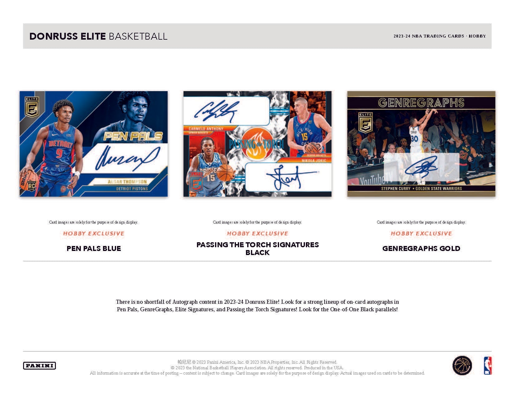 PEN PALS / PASSING THE TORCH SIGNATURES / GENREGRAPHS:Â There is no shortfall of Autograph content in 2023-24 Donruss Elite! Look for a strong lineup of on-card autographs in Pen Pals, GenreGraphs, Elite Signatures and Passing the Torch Signatures! Look for the One-of-One Black Parallels!