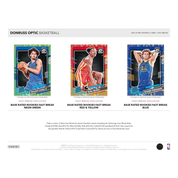 Find a variety of Fast Break Exclusive Base Parallel content including the following: Fast Break Holo, Purple (#’d/99), Red (#’d/75), Blue (#’d/49), Pink (#’d/25), Gold (#’d/10) and Black (#’d/1)! Also search for the parallels Fast Break Red and Yellow (#’d/7) and Neon Green (#’d/5), which are new to Fast Break this year! Look for 50 of the top rookies from the 2023 NBA Draft in the Base Rated Rookies set!