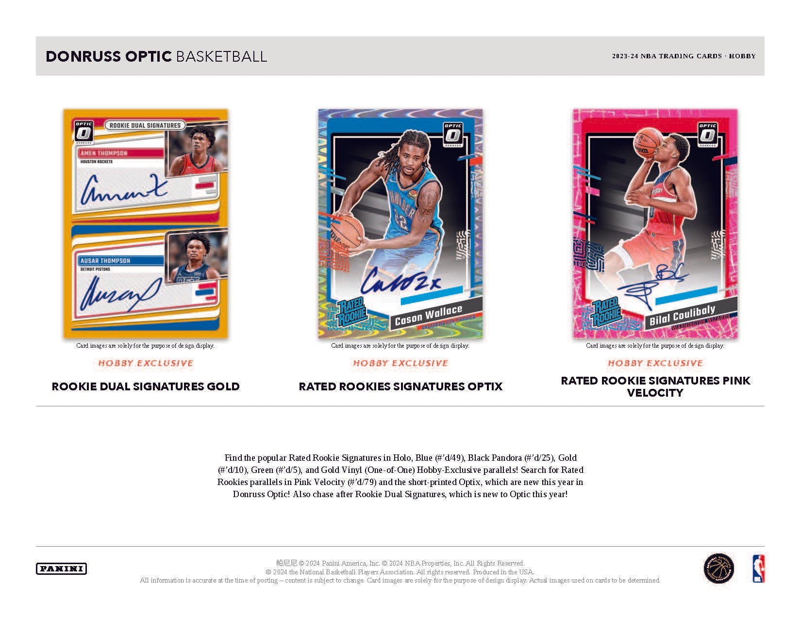 RATED ROOKIES SIGNATURES:Â Find the popular Rated Rookie Signatures in Holo, Blue (#'d/49), Black Pandora (#'d/25), Gold (#'d/10), Green (#'d/5), and Gold Vinyl (One-of-One) Hobby-Exclusive parallels! Search for Rated Rookies parallels in Pink Velocity (#'d/79) and the short-printed Optix, which are new this year in Donruss Optic! Also chase after Rookie Dual Signatures, which is new to Optic this year!