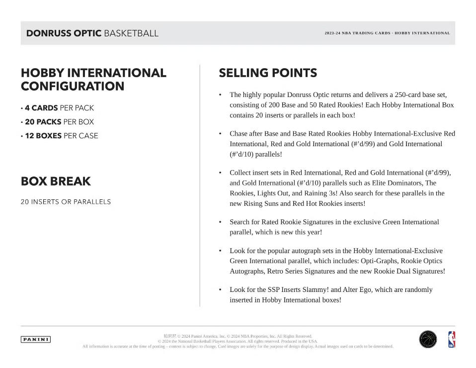The highly popular Donruss Optic returns and delivers a 250-card base set, consisting of 200 Base and 50 Rated Rookies! Each Hobby International Box contains 20 inserts or parallels in each box!