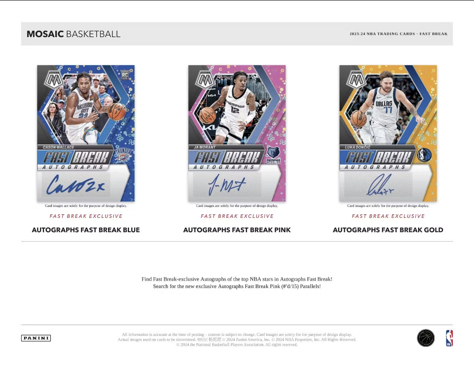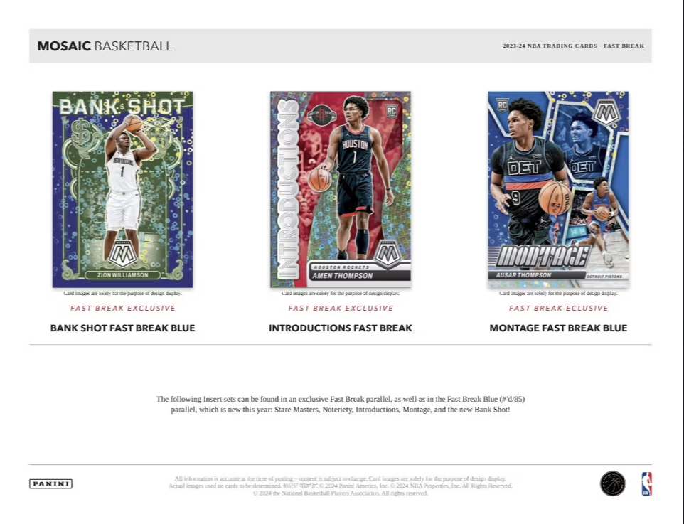 Collectors can chase after a wide range of Fast Break-Exclusive Base parallels including Mosaic Fast Break Silver, Blue (#'d /85), Purple (#'d /50), Pink (#'d /20), Gold (#'d /10) and the One-of-One Mosaic Fast Break Black!