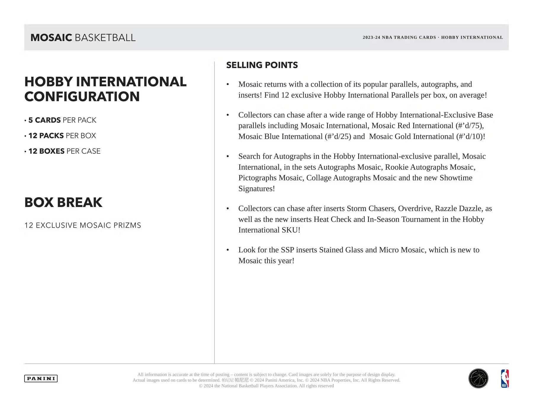 Collectors can chase after a wide range of Hobby International-Exclusive Base parallels including Mosaic International, Mosaic Red International (#'d/75), Mosaic Blue International (#'d/25) and Mosaic Gold International (#'d/10)!