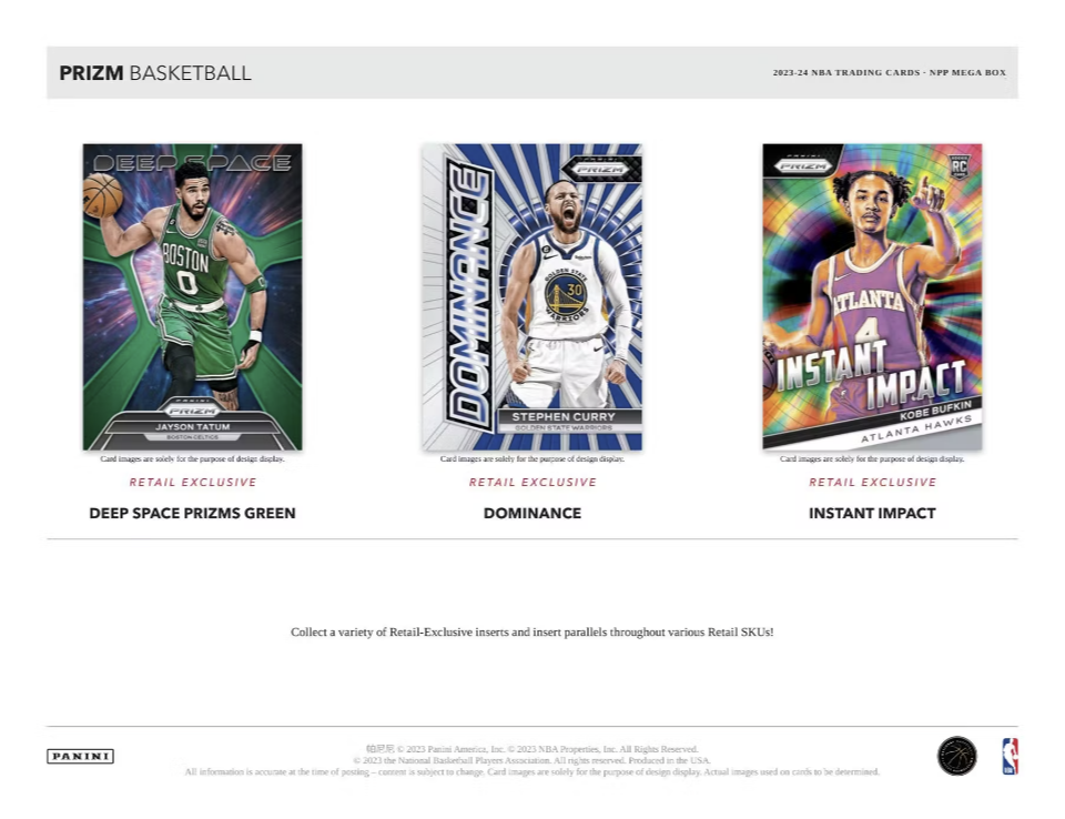 Search for Retail-Exclusive insert sets in Instant Impact, Emergent, Dominance, Global Reach, and Deep Space insert! Find these in the Prizms Silver and Prizms Green parallels, which can only be found exclusively across all Retail SKUs!