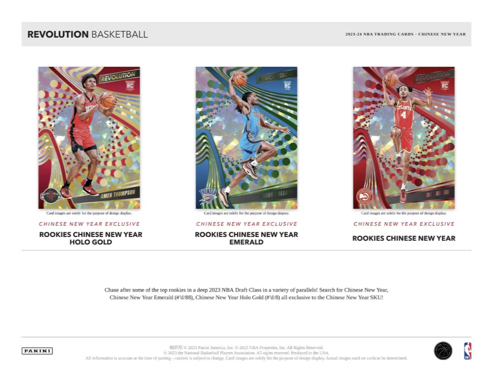 ROOKIES CHINESE NEW YEAR:Â Chase after some of the top rookies in a deep 2023 NBA Draft Class in a variety of parallels! Search for Chinese New Year, Chinese New Year Emerald (#'d /88), Chinese New Year Holo Gold (#'d /8) all exclusive to the Chinese New Year SKU!