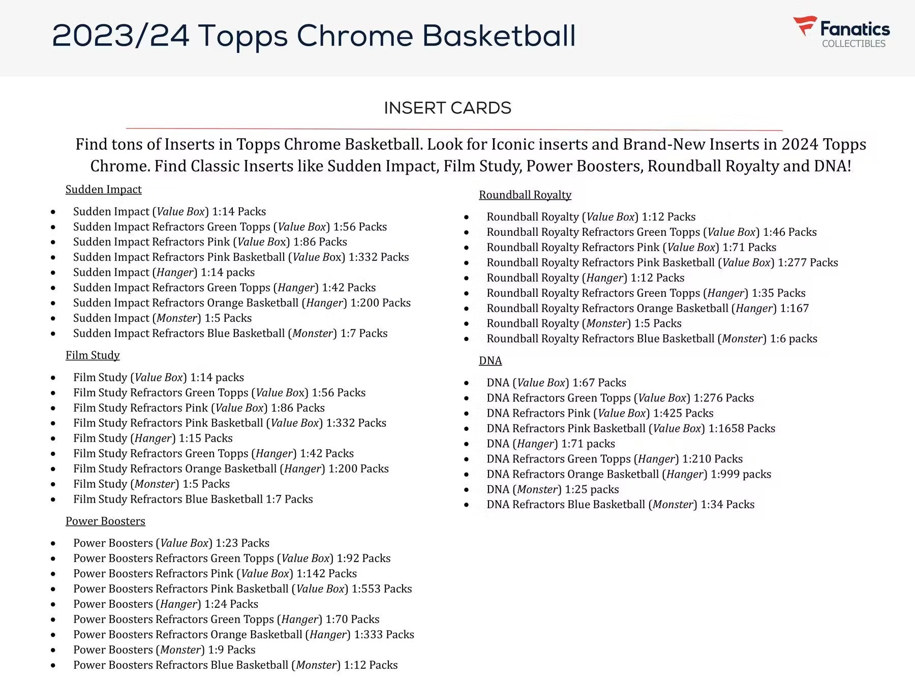 Find tons of Inserts in Topps Chrome Basketball. Look for Iconic inserts and Brand-New Inserts in 2024 Topps Chrome. Find Classic Inserts like Sudden Impact, Film Study, Power Boosters, Roundball Royalty and DNA!
