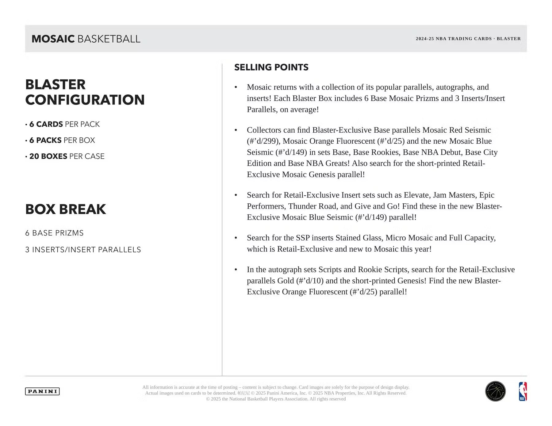 Collectors can find Blaster-Exclusive Base parallels Mosaic Red Seismic (#'d/299), Mosaic Orange Fluorescent (#'d/25) and the new Mosaic Blue Seismic (#'d/149) in sets Base, Base Rookies, Base NBA Debut, Base City Edition and Base NBA Greats! Also search for the short-printed RetailExclusive Mosaic Genesis parallel!