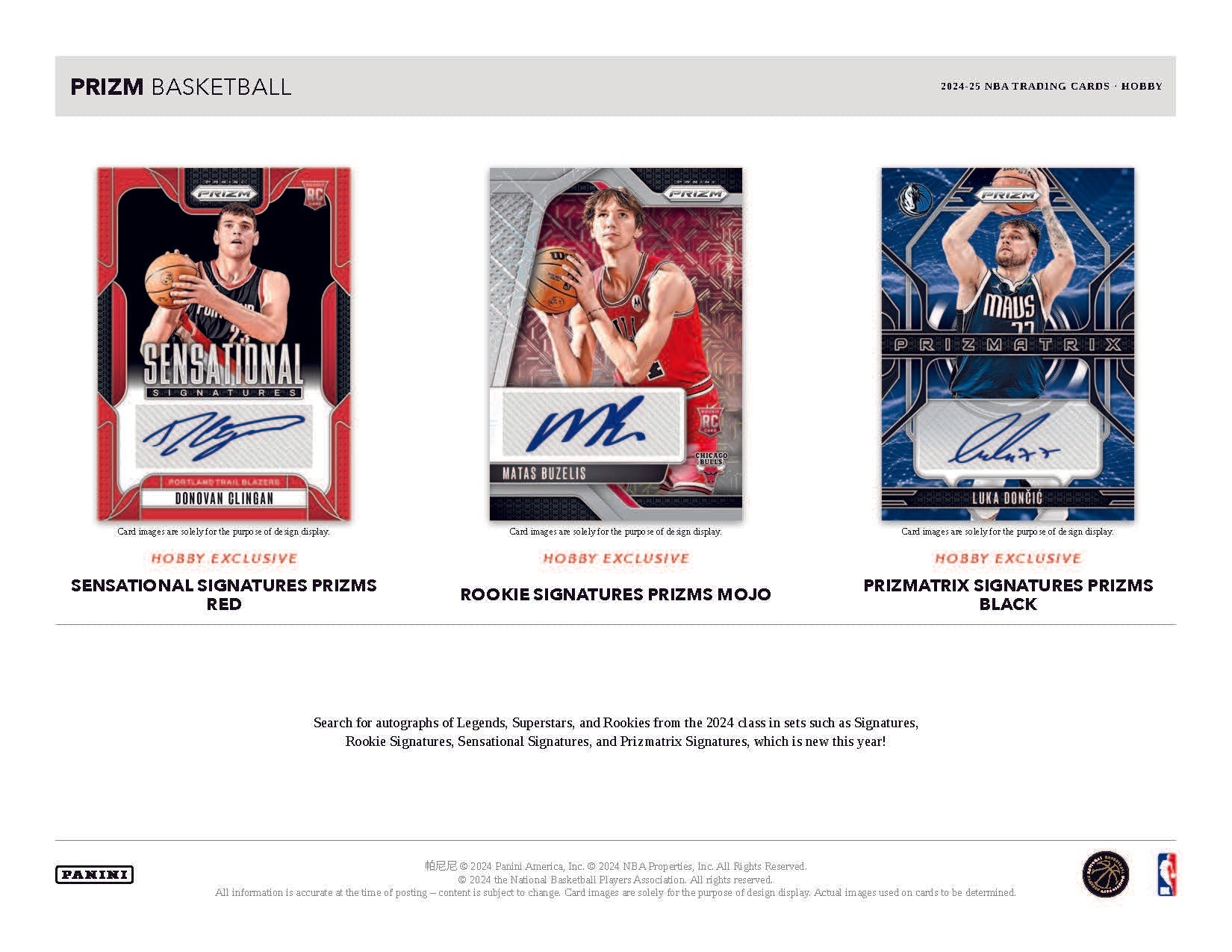 SENSATIONAL SIGNATURES / ROOKIE SIGNATURES / PRIZMATRIX SIGNATURES: Search for autographs of Legends, Superstars, and Rookies from the 2024 class in sets such as Signatures, Rookie Signatures, Sensational Signatures, and Prizmatrix Signatures, which is new this year!